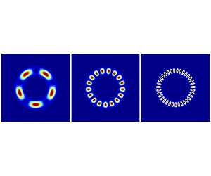 The quantum world is both elegant and mysterious. It is a sphere of existence where the laws of physics experienced in everyday life are broken--particles can exist in two places at once, they can react to each other over vast distances, and they themselves seem confused over whether they are particles or waves. For those not involved in the field, this world may seem trifling, but recently, researchers from the Okinawa Institute of Science and Technology Graduate University (OIST) have theoretically described two quantum states that are extraordinary in both the physics that define them and their visual appeal: a complex quantum system that simulates classical physics and a spellbinding necklace-like state. Their study is published in the journal Physical Review A. The quest for these states begins with a doughnut, or rather, a doughnut-shaped container housing a rotating superfluid. This superfluid, which is a fluid that moves with no friction, is made of Bose-Einstein condensates (BECs) comprising particles with no charge that are cooled to near-zero degrees kelvin, a temperature so cold, that it does not exist in the universe outside of laboratories. At this temperature, particles begin to exhibit strange properties--they clump together, and eventually become indistinguishable from one another. In effect, they become a single entity and thus move as one. Since this whirling BEC superfluid is operating at a quantum scale, where tiny distances and low temperatures reign, the physical characteristics of its rotation are not those seen in the classical world. Consider a father who is swinging his daughter around in a circle by the arms. Classical physics mandates that the child's legs will move faster than her hands around the circle, since her legs must travel further to make a complete turn. In the world of quantum physics the relationship is the opposite. "In a superfluid...things which are very far away [from the center] move really slowly, whereas things [that] are close to the center move very fast," explains OIST Professor Thomas Busch, one of the researchers involved in the study. This is what is happening in the superfluid doughnut. In addition, the superfluid inside of the doughnut shows a uniform density profile, meaning that it is distributed around the doughnut evenly. This would be the same for most liquids that are rotating via classical or quantum rules. But what happens if another type of BEC is added, one that is made from a different atomic species and that cannot mix with the original BEC? Like oil and water, the two components will separate in a way that minimizes the area in which they are touching and form two semicircles on opposite sides of the doughnut container. "The shortest boundary [between the components] is in the radial direction," Dr. Angela White, first author on the study, explains. The two components separate into different halves of the doughnut along this boundary, which is created by passing through the doughnut's radius. In this configuration, they will use less energy to remain separated than they would via any other. In the immiscible, or unmixable, the quantum world surprises. Since the boundary between the two superfluids must remain aligned along the radial direction, the superfluid present at this boundary must rotate like a classical object. This happens in order to maintain that low-energy state. If at the boundary the superfluids continued to rotate faster on the inside, then the two semicircles would start to twist, elongating the line that separates them, and thus requiring more energy to stay separated. The result is a sort of classical physics mimicry, where the system appears to jump into the classical realm, facilitated by complex quantum mechanical behavior. At this stage, the superfluid doughnut has reached its first extraordinary state which is one that mimics classical rotation. But there is one more step needed to transform this already mind-boggling system into the necklace end-goal: spin-orbit coupling. "In a very abstract way, [spin is] just a thing that has two possible states," Busch explains. "It can be this way or it can be that way." For this experiment, which involves particles that have no charge, or no spin, the researchers "faked" a spin by assigning a "this or that" property to their particles. When coupling the particles based on this property, the two semicircles inside of the doughnut break into multiple alternating parts, thus forming the necklace configuration (Figure 2). By digging further into its composition, the researchers found that the number of "pearls" in the necklace depends on the strength of the spin-orbit coupling and, more surprisingly, that there must always be an odd number of these pearls. Researchers have predicted quantum necklaces before, but they were known to be unstable--expanding or dissipating themselves to oblivion only a short time after being created. In this theoretical model, the OIST researchers believe they have found a way to create a stable necklace, one that would allow for more time to study it and appreciate its refined majesty.