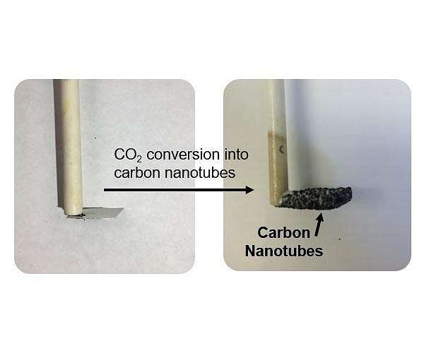 Imagine a box you plug into the wall that cleans your toxic air and pays you cash. That's essentially what Vanderbilt University researchers produced after discovering the blueprint for turning the carbon dioxide into the most valuable material ever sold - carbon nanotubes with small diameters. Carbon nanotubes are supermaterials that can be stronger than steel and more conductive than copper. The reason they're not in every application from batteries to tires is that these amazing properties only show up in the tiniest nanotubes, which are extremely expensive. Not only did the Vanderbilt team show they can make these materials from carbon dioxide sucked from the air, but how to do this in a way that is much cheaper than any other method out there. These materials, which Assistant Professor of Mechanical Engineering Cary Pint calls "black gold," could steer the conversation from the negative impact of emissions to how we can use them in future technology. "One of the most exciting things about what we've done is use electrochemistry to pull apart carbon dioxide into elemental constituents of carbon and oxygen and stitch together, with nanometer precision, those carbon atoms into new forms of matter," Pint said. "That opens the door to being able to generate really valuable products with carbon nanotubes. "These could revolutionize the world." In a report published in ACS Applied Materials and Interfaces, Pint, interdisciplinary material science Ph.D. student Anna Douglas and their team describe how tiny nanoparticles 10,000 times smaller than a human hair can be produced from coatings on stainless steel surfaces. The key was making them small enough to be valuable. "The cheapest carbon nanotubes on the market cost around $100-200 per kilogram," Douglas said. "Our research advance demonstrates a pathway to synthesize carbon nanotubes better in quality than these materials with lower cost and using carbon dioxide captured from the air." But making small nanotubes is no small task. The research team showed that a process called Ostwald ripening - where the nanoparticles that grow the carbon nanotubes change in size to larger diameters - is a key contender against producing the infinitely more useful size. The team showed they could partially overcome this by tuning electrochemical parameters to minimize these pesky large nanoparticles. This core technology led Pint and Douglas to co-found SkyNano LLC, a company focused on building upon the science of this process to scale up and commercialize products from these materials. "What we've learned is the science that opens the door to now build some of the most valuable materials in our world, such as diamonds and single-walled carbon nanotubes, from carbon dioxide that we capture from air through our process," Pint said.