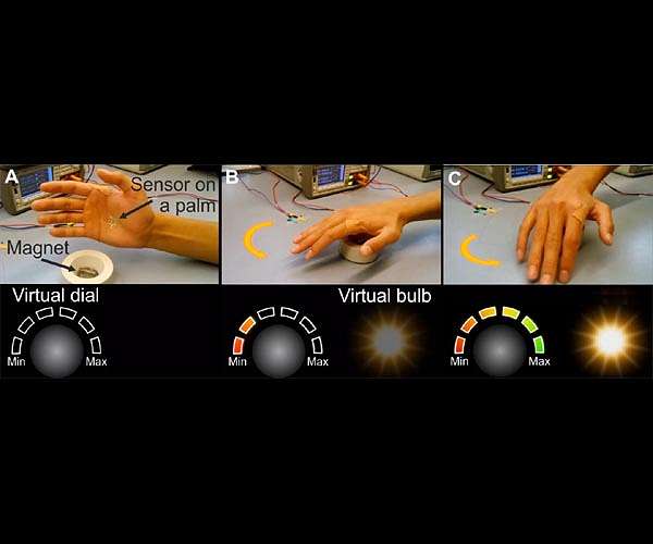 A virtual lamp "By coding the angles between 0 and 180 degrees so that they corresponded to a typical hand movement when adjusting a lamp, we created a dimmer - and controlled it just with a hand movement over the permanent magnet," says Makarov, describing one of the experiments. The researchers were also able to use a virtual dial in the same way. The physicists at Dresden envision that their approach provides a unique alternative for interfacing the physical and the virtual world that goes far beyond what is possible with current technologies. "To manipulate virtual objects, current systems essentially capture a moving body by optical means," Makarov explains. "This requires, on one hand, a load of cameras and accelerometers and, on the other hand, fast image data processing. However, usually the resolution is not sufficient to reconstruct fine movements of the fingers. Moreover, because they are so bulky, the standard gloves and glasses hamper the experience of virtual reality." The skin-like sensors could be a better way of connecting human and machine, according to Martin Kaltenbrunner: "As our polymer foils are not even three micrometers thick, you can easily wear them on your body. Just by way of comparison: a normal human hair is roughly 50 micrometers thick." As further experiments have shown, the sensors can also withstand bending, folding and stretching without losing their functionality. Thus, in Oliver G. Schmidt's opinion, they are suitable for the incorporation into soft, shapeable materials like textiles to manufacture wearable electronics. Makarov sees an additional advantage to the new approach in contrast to optical systems: no direct line of sight between the object and the sensors is necessary. This could open up potential applications in the security industry, as well. Buttons or control panels in rooms which cannot be entered in hazardous situations, for example, could be operated by remote control via the sensors.