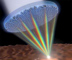 Single metalens focuses all colors of the rainbow in one point Boston MA (SPX) Jan 02, 2018 Metalenses - flat surfaces that use nanostructures to focus light - promise to revolutionize optics by replacing the bulky, curved lenses currently used in optical devices with a simple, flat surface. But, these metalenses have remained limited in the spectrum of light they can focus well. Now a team of researchers at the Harvard John A. Paulson School of Engineering and Applied Sciences (SEAS) has developed the first single lens that can focus the entire visible spectrum of light - including whit ... read more