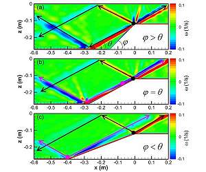 Ocean circulation patterns have a profound effect on global climate. Waves deep within the ocean play an important role in establishing this circulation, arising when tidal currents oscillate over an uneven ocean bottom. The internal waves that are generated by this process stir and mix the ocean, bringing cold, deep water to the surface to be warmed by the sun. This week in the journal Physics of Fluids, from AIP Publishing, investigators from the South China Sea Institute of Oceanography report how to tell which way internal waves will go. The proposed theory unifies several previously understood explanations of wave propagation. Without these internal waves, deep ocean circulation would shut down and the oceans would become stratified into warm water layered over permanently cold deep water. As the tides sweep water back and forth over the ocean bottom every day, many waves are created that stretch vertically from the ocean bottom to the surface of the sea. The repetitive motion of these tidal oscillations causes the vertical waves to superimpose, or accumulate, until a so-called "wave beam" forms. This composite wave transports water from the ocean depths to the surface and behaves somewhat like a beam of light - hence its name. The hills, ridges and valleys of the ocean bottom play a key role in the generation of wave beams. The boundary of a continental shelf, presenting a sharp edge or break in the slope, is also important in this process. A key parameter involves two angles, one being the angle the ocean bottom makes with the horizontal, and the other, the wave beam itself. If the ocean bottom slope angle is less than the wave beam angle, the situation is "subcritical". A "supercritical" situation arises when the topographic slope exceeds the wave beam angle. A "critical" situation exists when the two angles match. The work reported in Physics of Fluids explores the generation of internal waves in all three cases and explains of wave beams direct themselves. The accompanying figure shows typical results from the published simulations. The existence of wave beams transverse to the ocean bottom topography has been controversial and recent explanations for these are inadequate. The present study was carried out to clarify the literature. The investigators encountered a somewhat surprising result for the beam lying on a critical slope. The origin point for wave beams (magenta dot in panel (b) of the figure) is near, but still some distance down from, the abrupt break in the continental shelf. Theoretically, internal waves should be generated along the entire down-slope, so it is not clear why beams should originate from this one mysterious place. Future research will focus on determining why this feature arises and what it means for simulations of this important global phenomenon. The article, "Selection of internal wave beam directions by a geometric constraint provided by topography," is authored by Zhiwu Chen, Jieshuo Xie, Jiexin Xu, Yinghui He and Shuqun Cai.